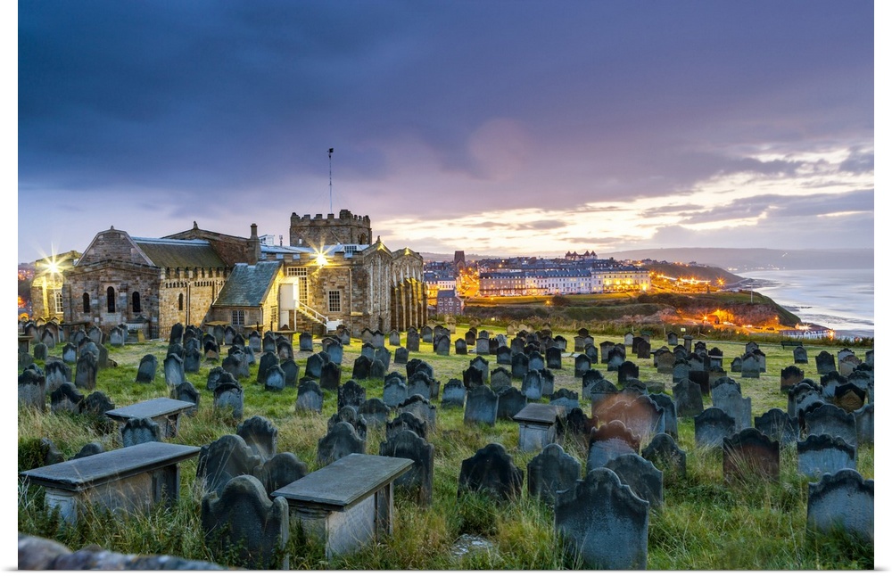 <p>England, Great Britain, North Yorkshire, Whitby, Saint Mary's Parish Church with headstones at dusk</p>