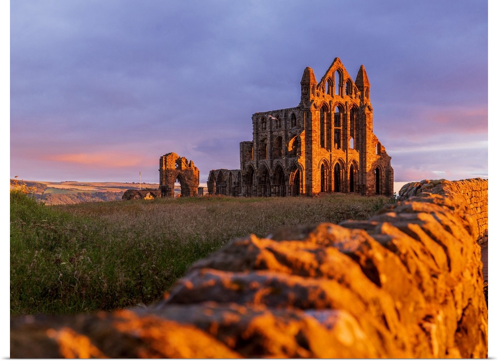 <p>England, North Yorkshire, Whitby, Great Britain, British Isles, Sunrise over the gothic ruins of Whitby Abbey, a Benedictine monastery founded in the 11th century</p>
