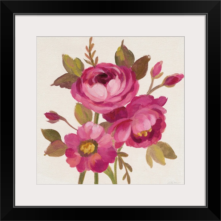 <p>Contemporary square painting of pink flowers and buds.</p>