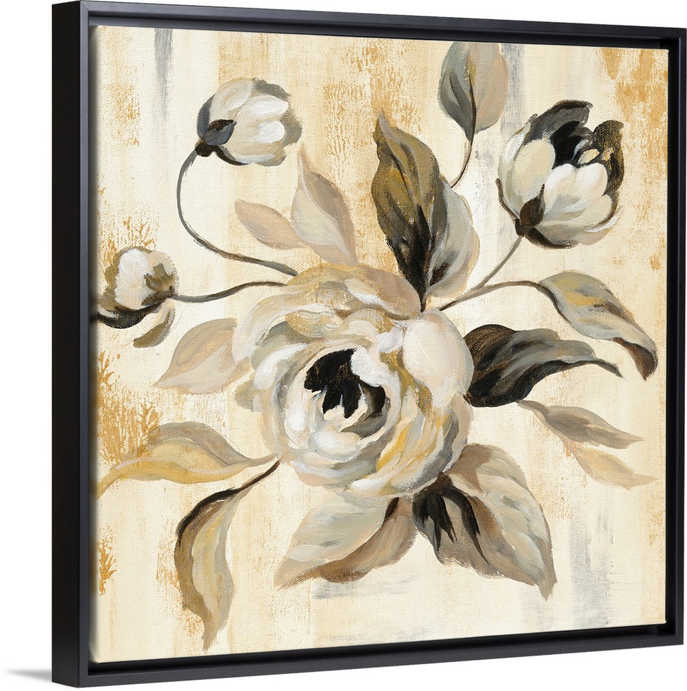 <p>Square painting of white English Roses on a beige and brown background with metallic gold markings.</p>