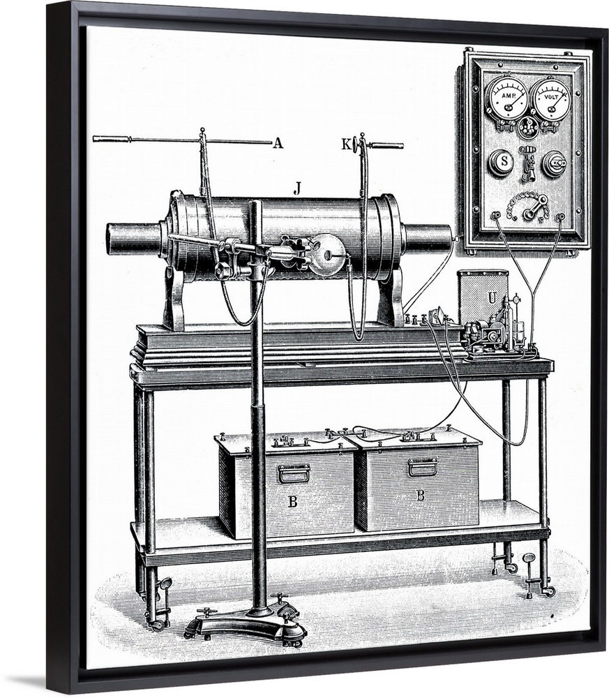 <p>Engraving depicting a general view of early xray apparatus powered by wet cells. Dated 20th Century.</p>