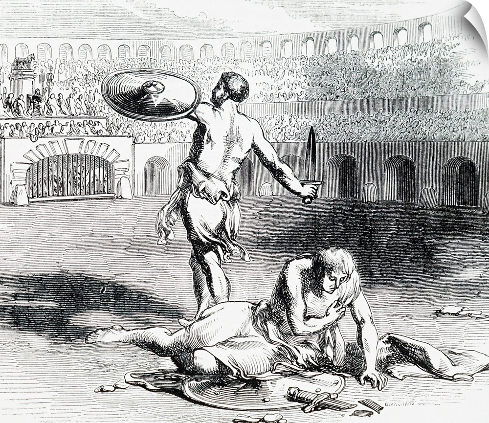 <p>Engraving depicting gladiators fighting within the Colosseum in Rome. Dated 18th Century.</p>