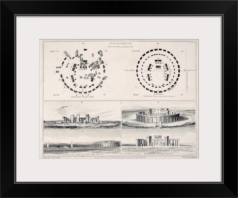 <p>Engraving depicting Stonehenge as it was in the 19th Century and how it might have been when it was originally built. Dated 19th Century.</p>