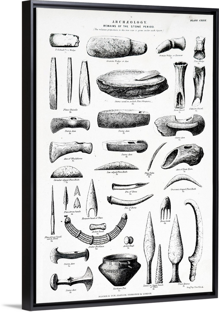 <p>Engraving depicting the remains of Stone Age tools including: Polished front wedge, granite wedge or axe, granite wedge or hammer, and pins. Dated 19th Century.</p>