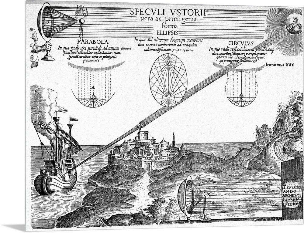 <p>An illustration showing sun rays and a mirror used to set fire to Roman ships at Syracuse. Kircher explored and illustrated the burning mirror purportedly developed by Archimedes in 214 B.C.</p>