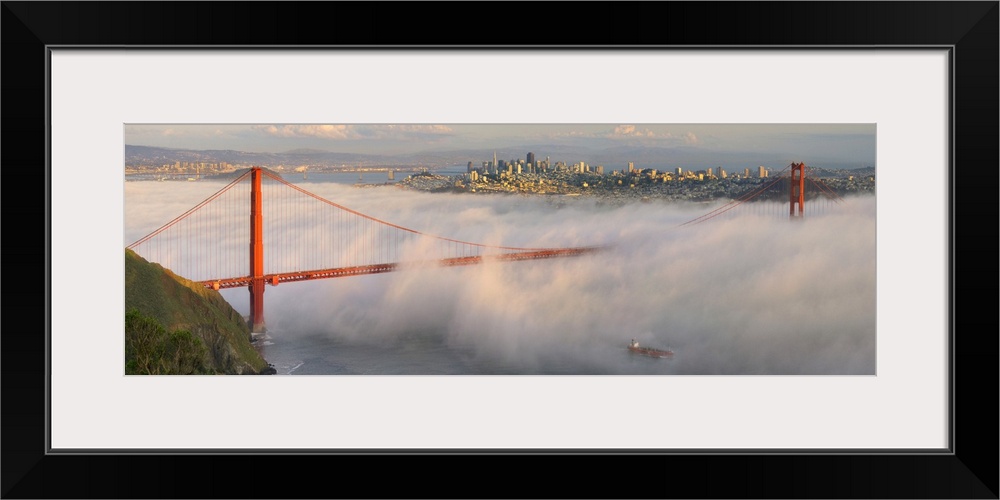 <p>Panoramic photograph of the foggy golden gate bridge in San Francisco with the skyline in the background.</p>