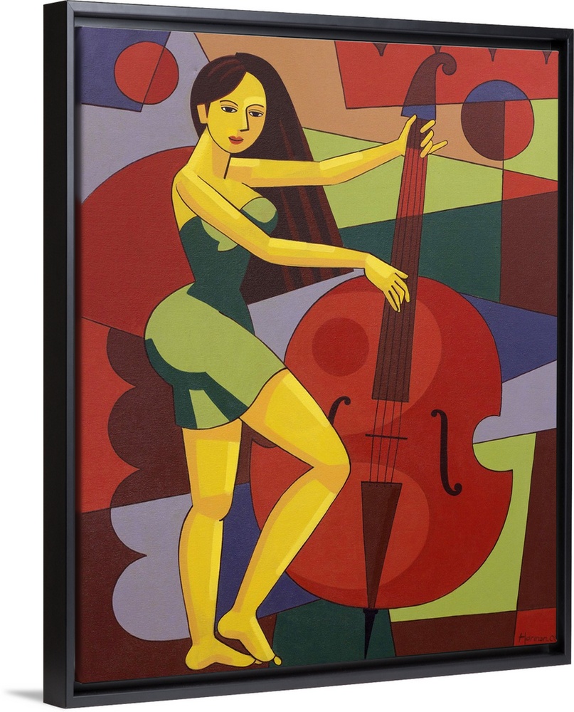 <p>Plucking the strings of her contrabass, a woman accompanies herself in an expression of song. Harman depicts her in a cool sarong as she performs a solo concert. Cubist elements create the effect of a dream in this beautiful abstract portrait. 'Self enjoyment is a positive way to avoid boredom and problems,' the Javanese artist says.</p>