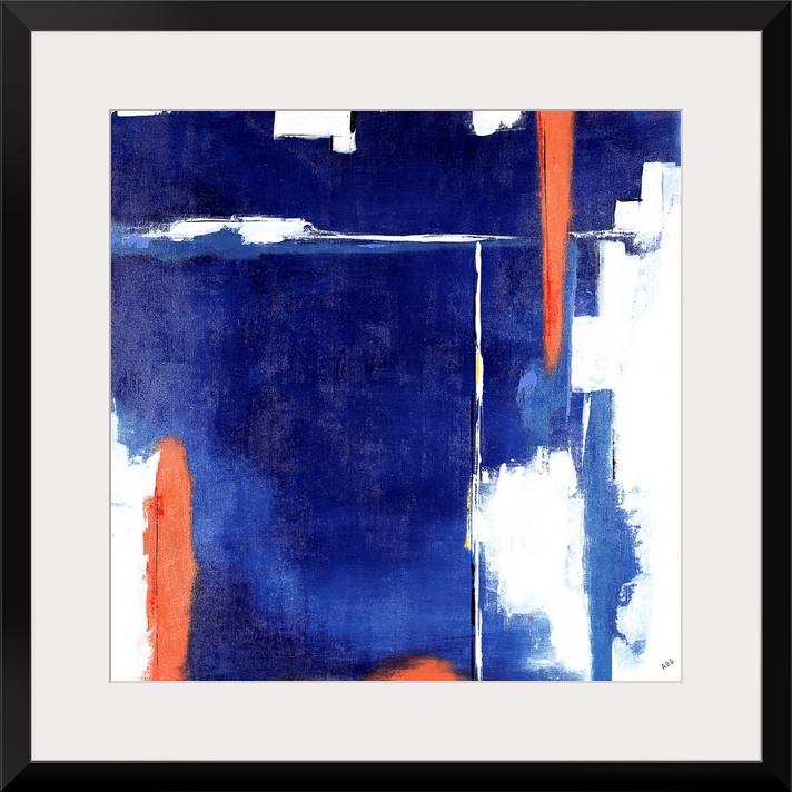 <p>Square abstract art with heavy blue hues on the background and bright orange, white, and yellow lines on top.</p>