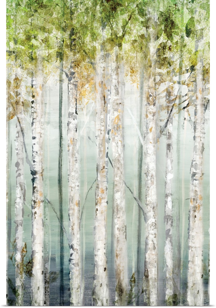 <p>Contemporary painting of rows of trees with textured leaves in green.</p>
