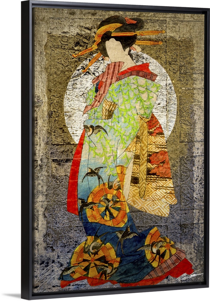 <p>Colorful artwork of a woman wearing a floral kimono.</p>