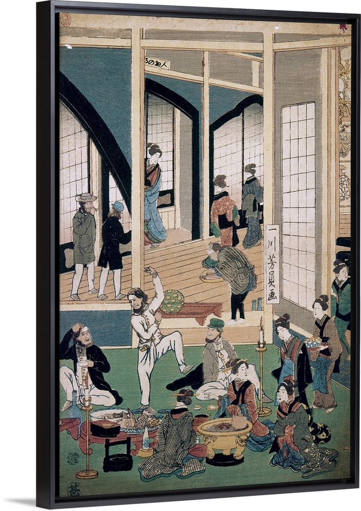 <p>Yokohama, Restaurant, 1861. Entertainment For Foreigners At A Restaurant In the Gankiro District, Yokohama, Japan. Woodblock Print, 1861, By Issen Hoin.</p>