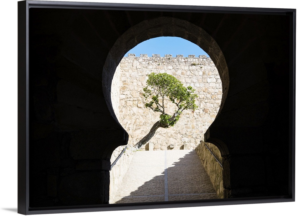 <p>Horseshoe shape arch framing the tree at the entrance gate of Castillo de Trujillo (Trujillo Castle), Extremadura, Caceres, Spain</p>