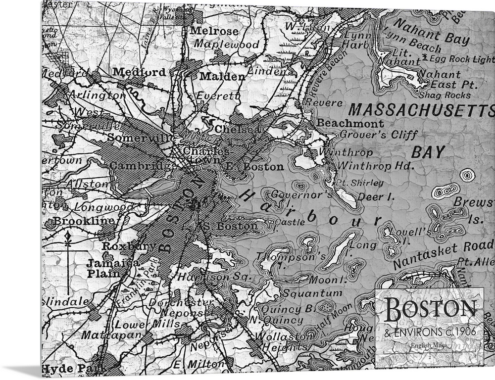 <p>Rustic contemporary art map of Boston districts, in black and white.</p>