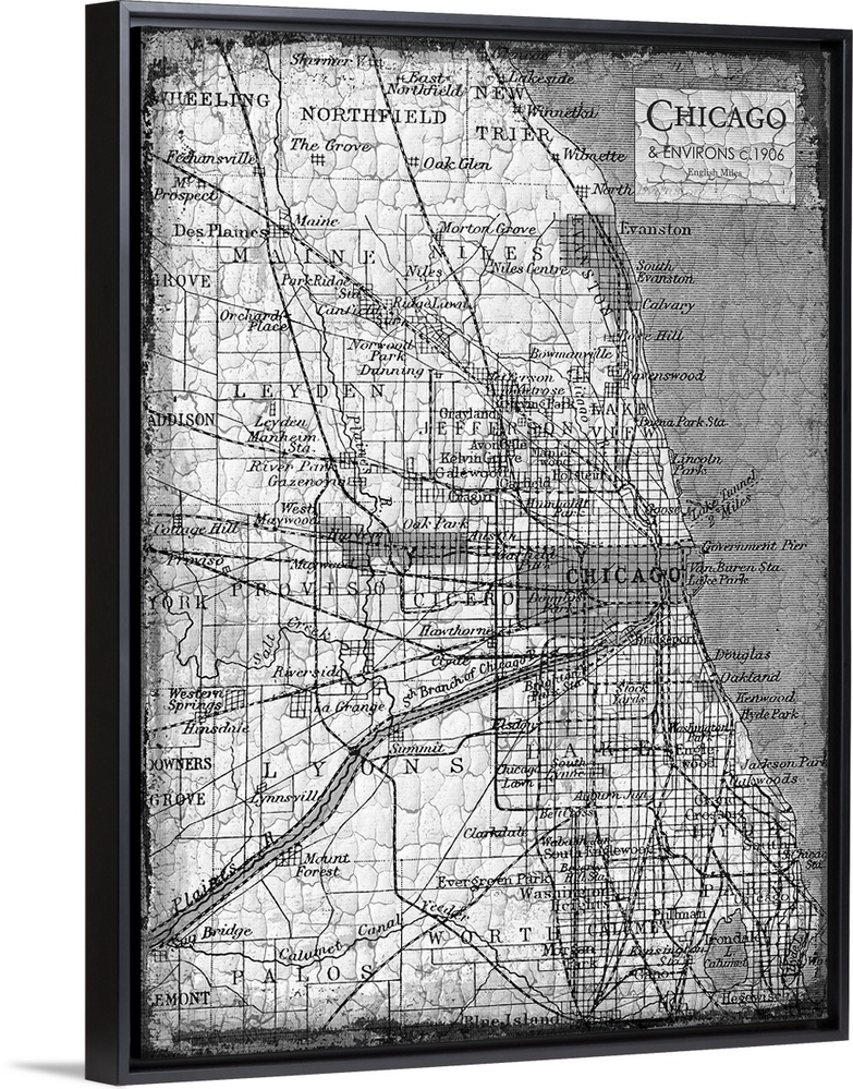 <p>Rustic contemporary art map of Chicago districts, in black and white.</p>