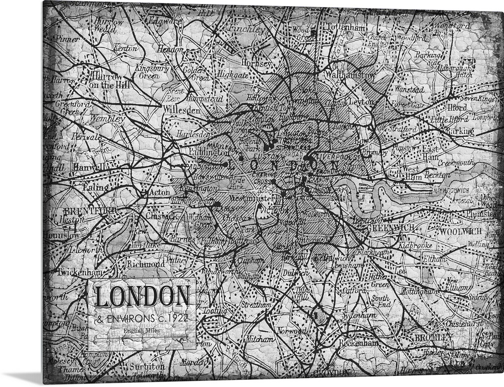 <p>Rustic contemporary art map of London districts, in black and white.</p>
