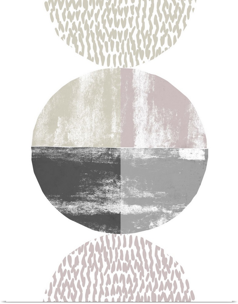 <p>Abstract artwork with a midcentury feel of round shapes in grey and puce.</p>