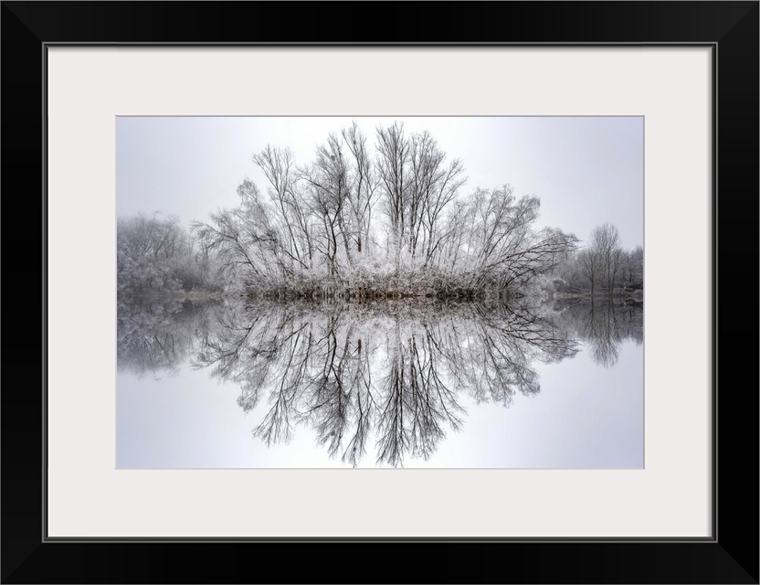 <p>Photograph of a rounded and frozen tree line reflecting onto a calm, glassy lake.</p>
