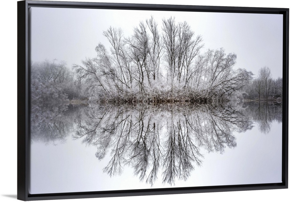 <p>Photograph of a rounded and frozen tree line reflecting onto a calm, glassy lake.</p>