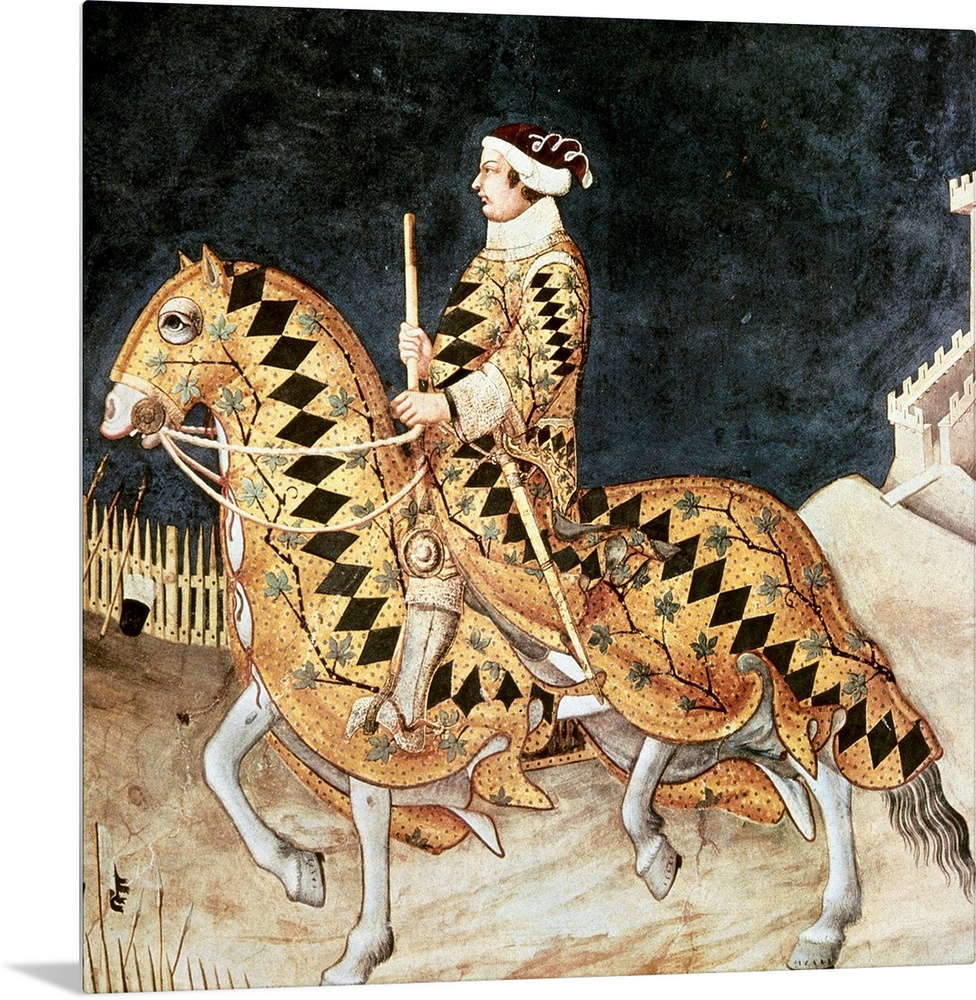 <p>MARTINI, Simone di Martino, called Simone (1284-1344). Equestrian portrait of Guidoriccio da Fogliano. 1328-1330. ITALY. Siena. Public Palace. Upper center detail. International gothic. Fresco. -</p>