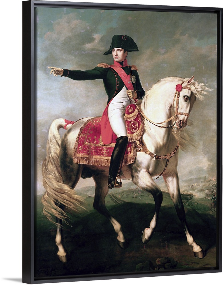 <p>Portrait, classic painting of Napoleon I in his uniform, pointing and looking to his right as he sits upon a white horse with a decorated saddle cover, an overcast sky in the background.</p>
