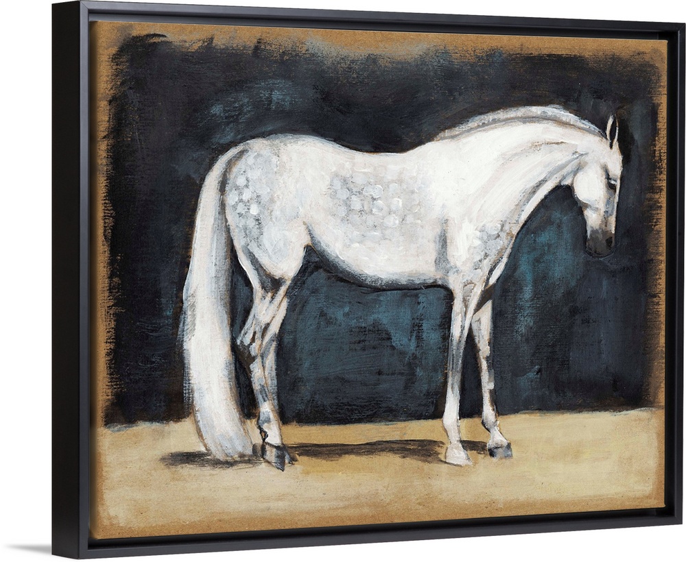 <p>Contemporary painting of a white horse against a dark background.</p>