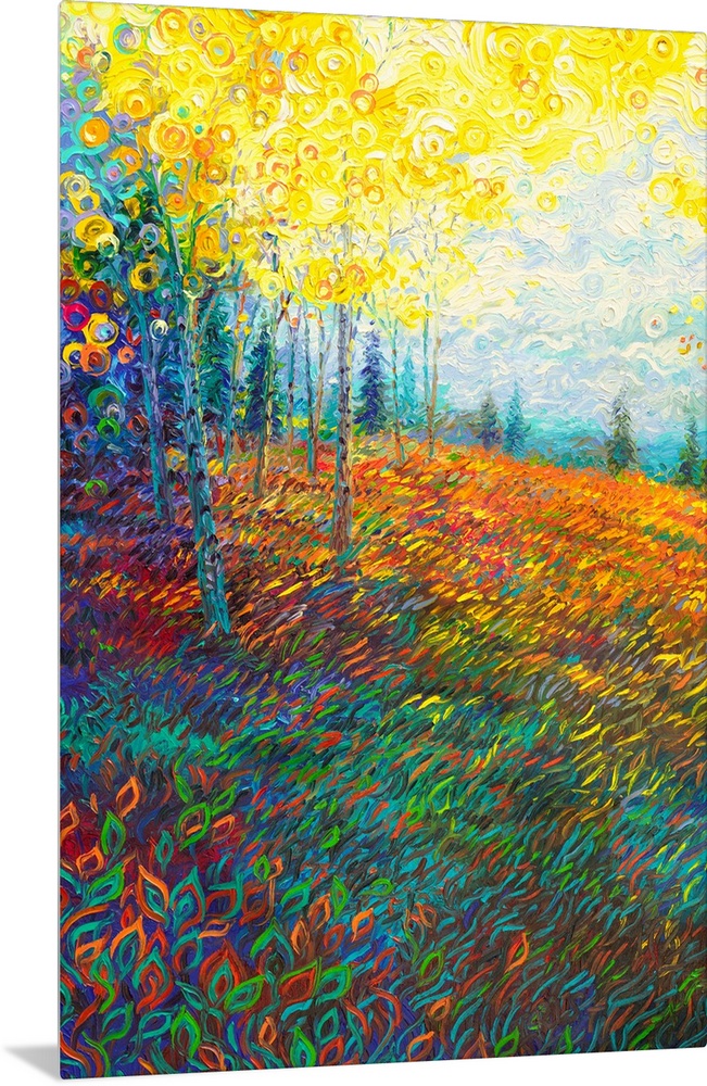 <p>Brightly colored contemporary artwork of a landscape of trees in a field.</p>
