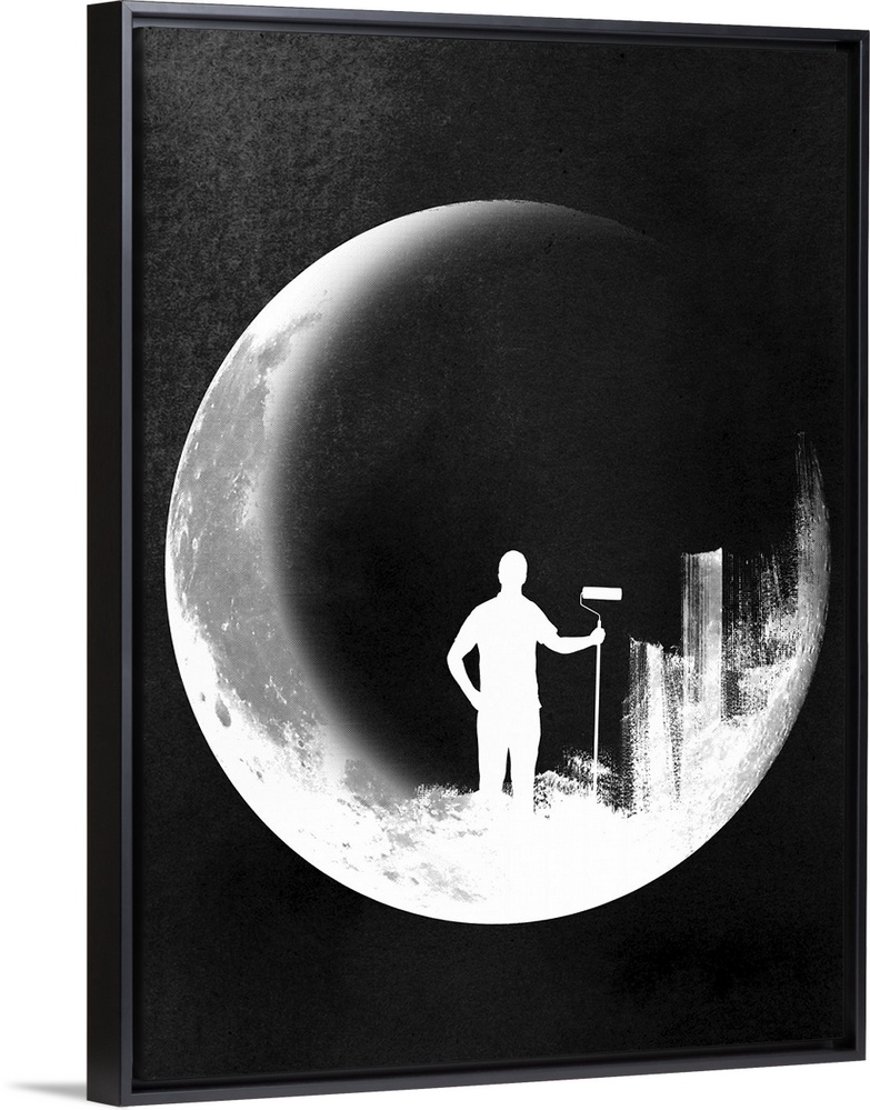 <p>Contemporary silhouetted image of man inside of the moon with a paintbrush.</p>