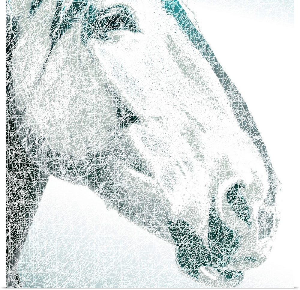 <p>A square digital illustration of the face of a horse done in shades of blue and gray with white cross hatching lines overlapping.</p>