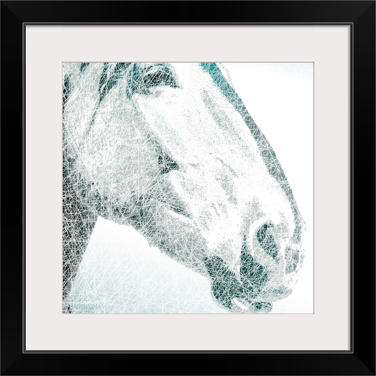 <p>A square digital illustration of the face of a horse done in shades of blue and gray with white cross hatching lines overlapping.</p>