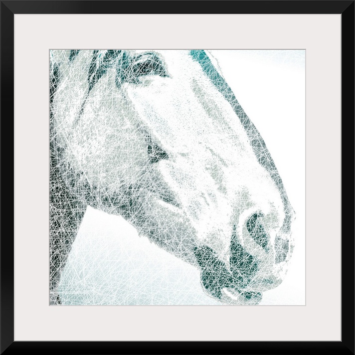 <p>A square digital illustration of the face of a horse done in shades of blue and gray with white cross hatching lines overlapping.</p>