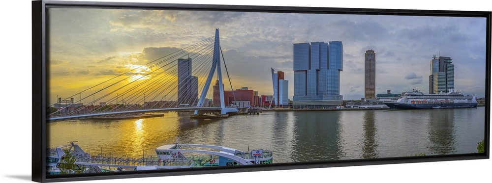 <p>Netherlands, South Holland, Rotterdam, Erasmusbrug, Erasmus Bridge and Wilhelminakade 137, De Rotterdam, The Rotterdam Building, Sunrise</p>