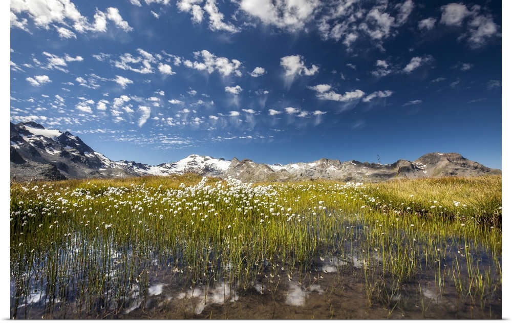 <p>Eriophorus (cotton grass) blooming in the water of a lake in Upper Engadine, surrounded by the Swiss Alps, Graubunden, Switzerland, Europe</p>