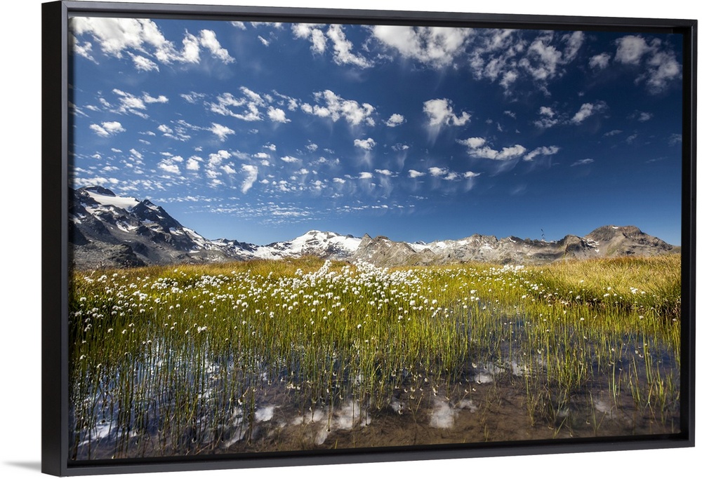 <p>Eriophorus (cotton grass) blooming in the water of a lake in Upper Engadine, surrounded by the Swiss Alps, Graubunden, Switzerland, Europe</p>