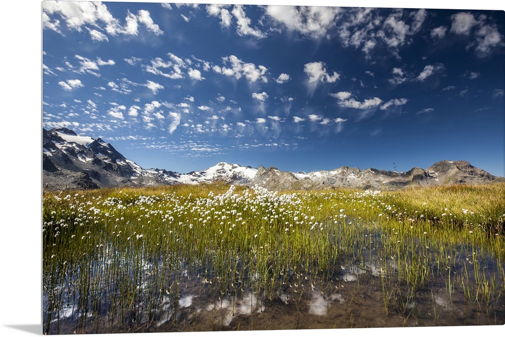 <p>Eriophorus (cotton grass) blooming in the water of a lake in Upper Engadine, surrounded by the Swiss Alps, Graubunden, Switzerland, Europe</p>