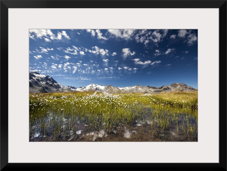 <p>Eriophorus (cotton grass) blooming in the water of a lake in Upper Engadine, surrounded by the Swiss Alps, Graubunden, Switzerland, Europe</p>