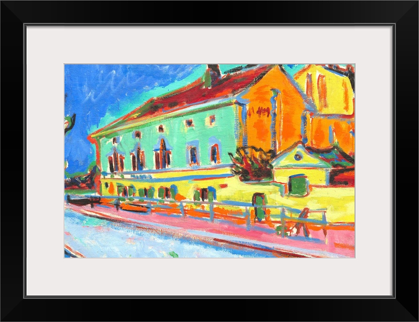 <p>Ernst Ludwig Kirchner, by Houses in Dresden, 1909-10, German painting, oil on canvas. This work was painted while Kirchner's style was a fusion of Fauvism, Art Nouveau, and Die Brucke group German Expressionism</p>