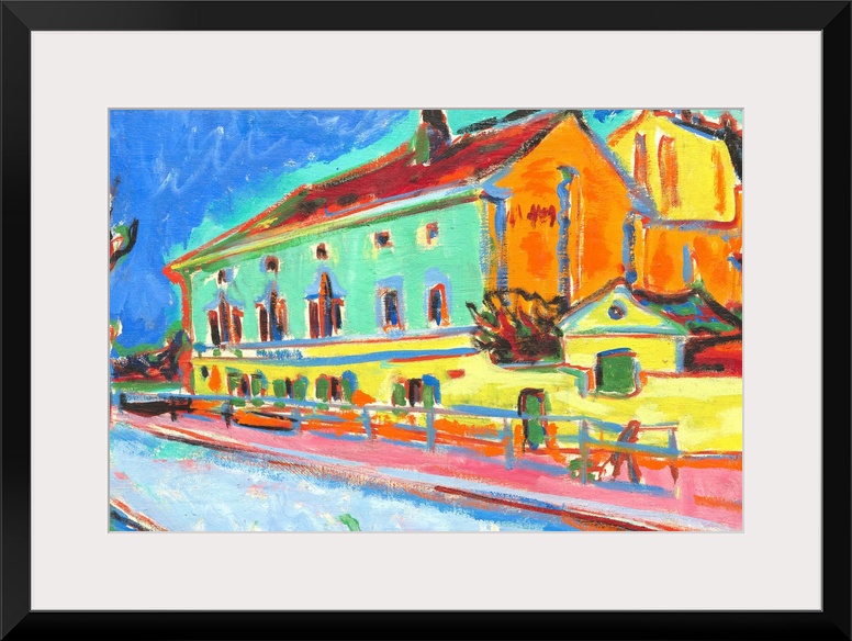 <p>Ernst Ludwig Kirchner, by Houses in Dresden, 1909-10, German painting, oil on canvas. This work was painted while Kirchner's style was a fusion of Fauvism, Art Nouveau, and Die Brucke group German Expressionism</p>
