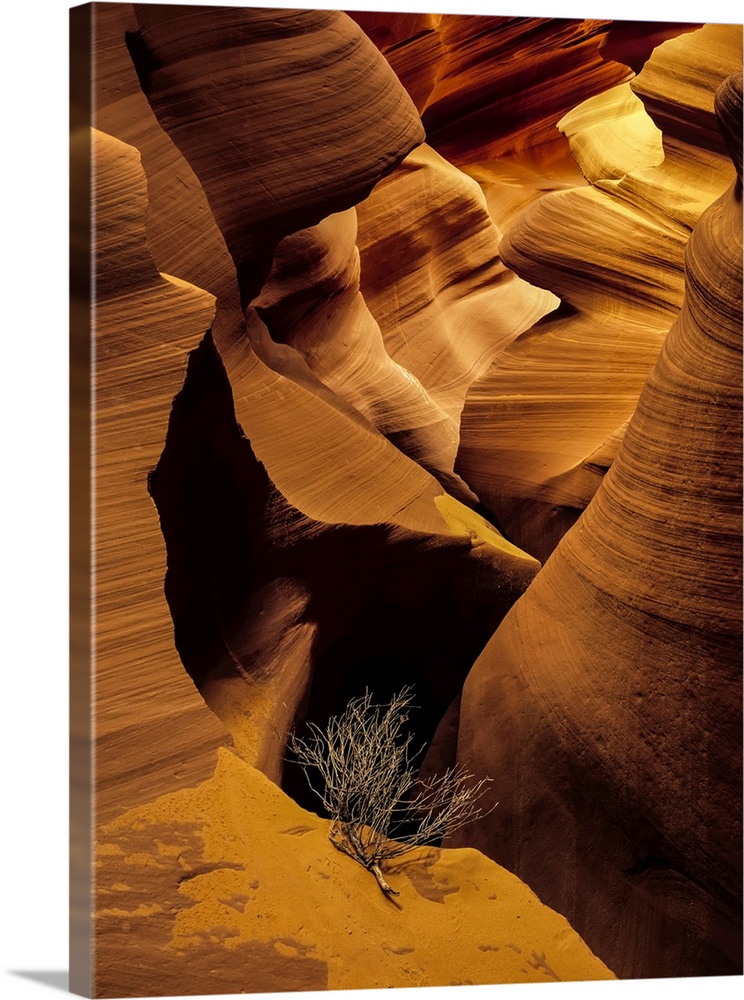 <p>Large vertical photograph of an eroded canyon. Single tumbleweed branch in foreground amplifies vastness and emptiness of canyon.</p>