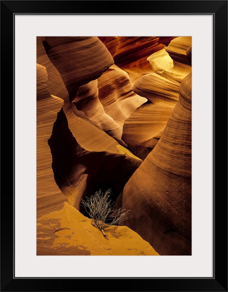 <p>Large vertical photograph of an eroded canyon. Single tumbleweed branch in foreground amplifies vastness and emptiness of canyon.</p>