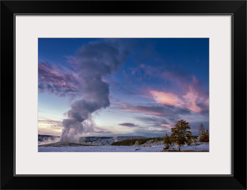 <p>Eruption of Old Faithful Geyser after Sunset. Yellowstone National Park. Wyoming.</p>