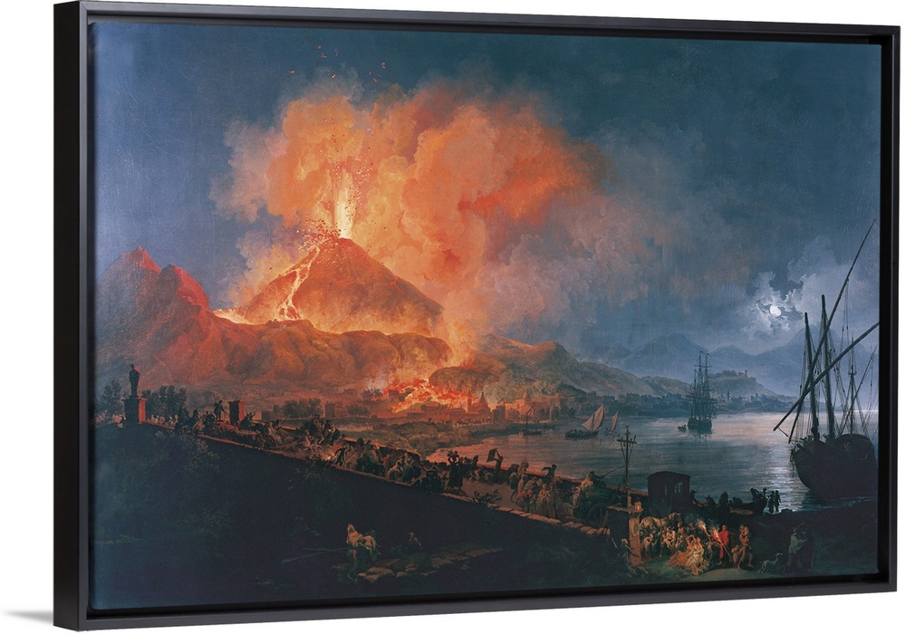 <p>Eruption of Vesuvius from the Ponte della Maddalena (Eruzione del Vesuvio dal Ponte della Maddalena), by Pierre-Jacques Volaire, 1777, 18th Century, oil on canvas, Whole artwork view. A beloved theme of a lot of painters travelling around Italy during the Eighteenth century is the volcanic activity in the gulf of Naples; on the background stands out the red-flamed Vesuvius deep in an eruption, while the lava drips downline of the city; in the foreground, a bridge crowded with people escaping across the gulf where are docked two boats., Oil on canvas, 1777.</p>