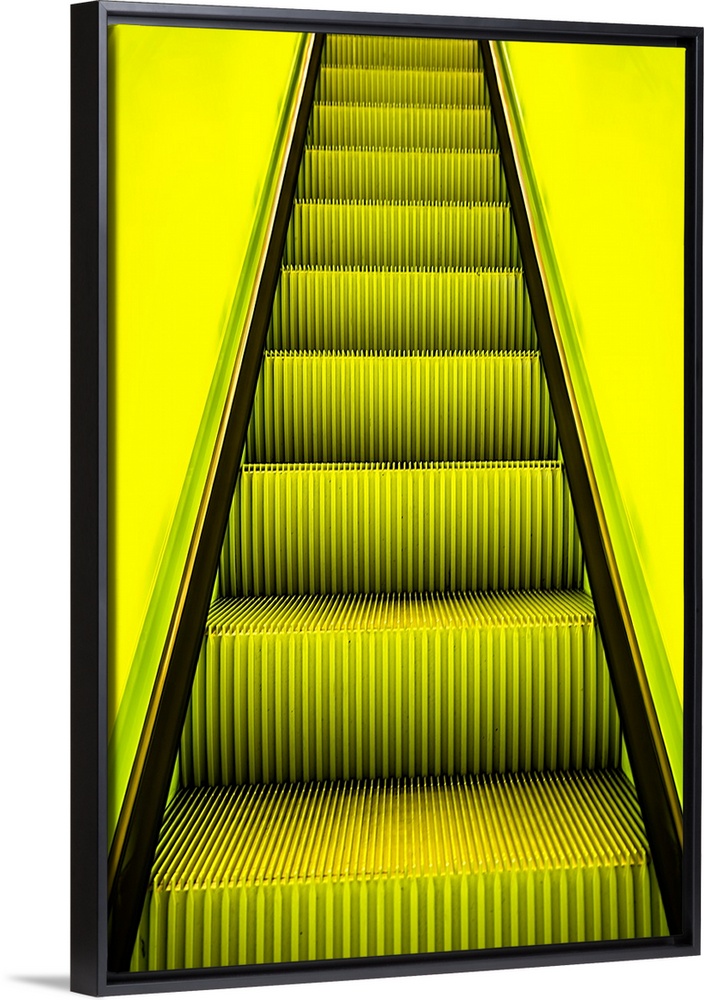 <p>Bright yellow light on escalator steps leading upwards.</p>