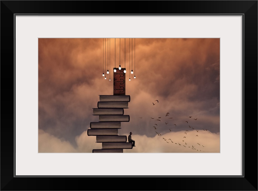 <p>A conceptual photograph of a stack of books with a door at the top reaching the sky filled with orange clouds, with a man sitting the edge of one of the books.</p>