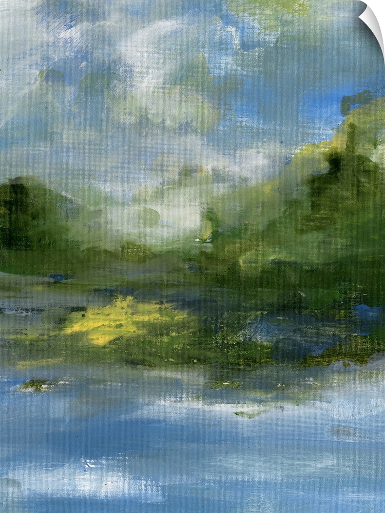 <p>Contemporary landscape painting of a lake with verdant hills and a cloudy sky.</p>