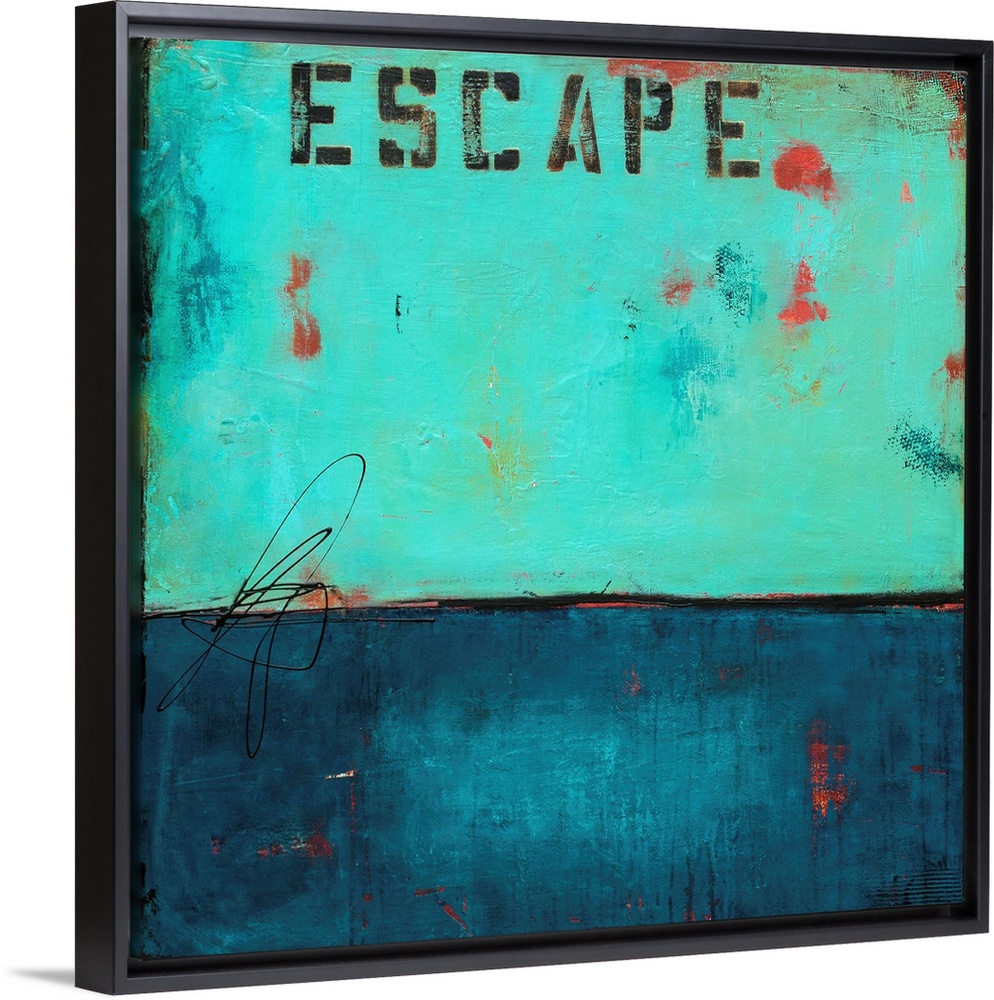 <p>Square abstract art created in shades of blue with pops of red throughout and the word "Escape" stenciled at the top.</p>