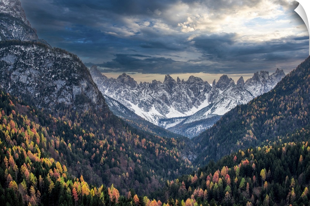 <p>While I was traveling I noticed this wonderful glimpse. It is a mountain range in the Veneto and Friulian Dolomites. Their name is an Italianization of the name of the Germanic god Thor. For this shot I used a focal length of 80mm at f8 to have a good depth of field. In late autumn the treetops change colour. It's a truly wonderful scene.</p>