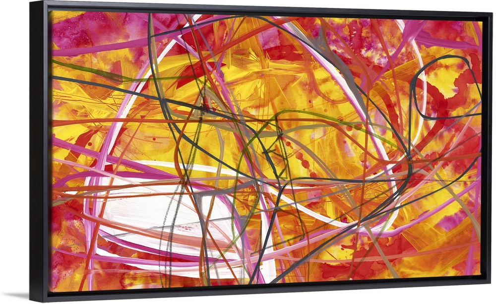 <p>A contemporary abstract painting of warm tones tangled together in a web of thin strokes against a pink and yellow background.</p>