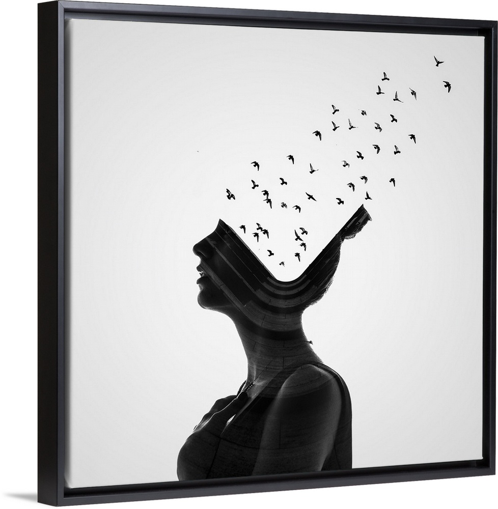 <p>A conceptual photograph of a profile of a woman with birds flying from her head.</p>