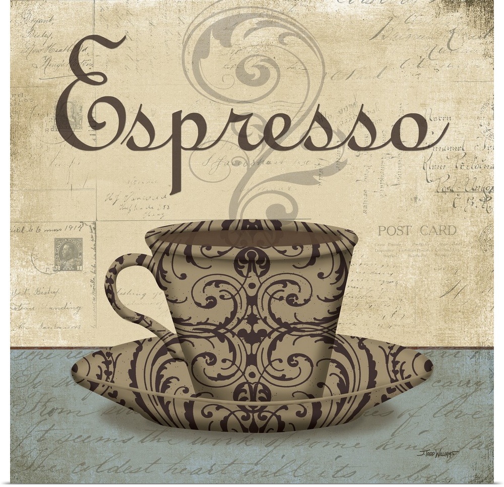 <p>Square cafe decor with an illustration of a decorative coffee cup on a saucer in brown tones, "Espresso" written at the top, and faint post card stamps and handwriting on the background.</p>