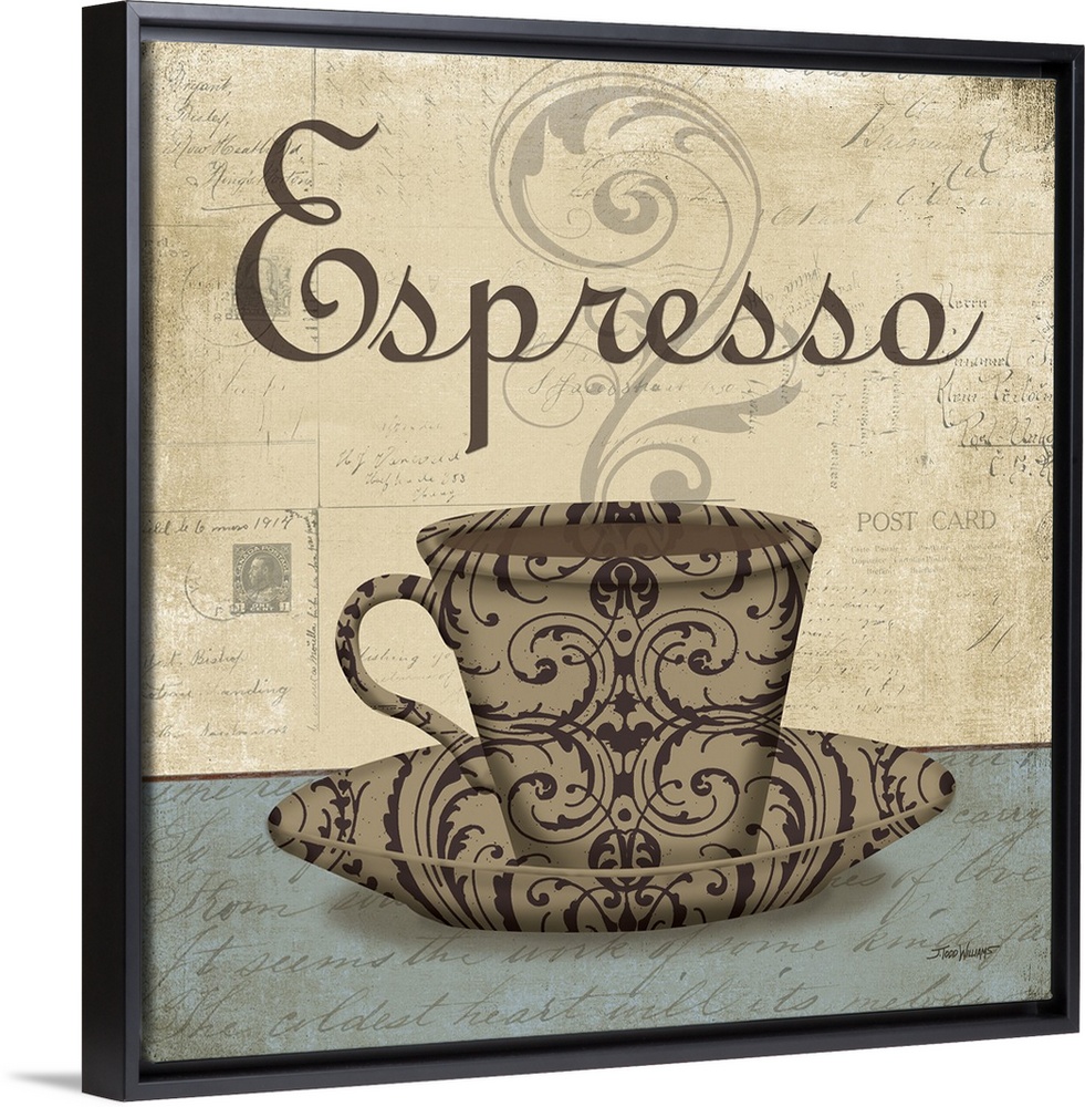 <p>Square cafe decor with an illustration of a decorative coffee cup on a saucer in brown tones, "Espresso" written at the top, and faint post card stamps and handwriting on the background.</p>
